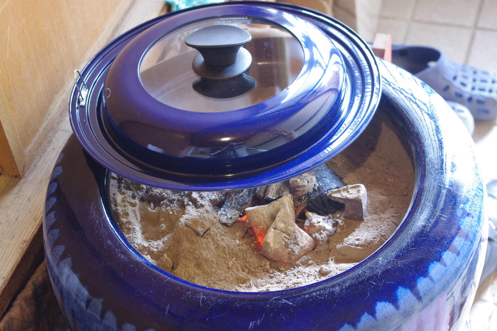 掃除の後は、薪に火を着けて、囲炉裏に火を入れ、風呂を沸かし、ご飯も炊きました。鍋ではブタ汁を煮て、紀州備長炭も熾して鮎と鶏肉も焼きました。