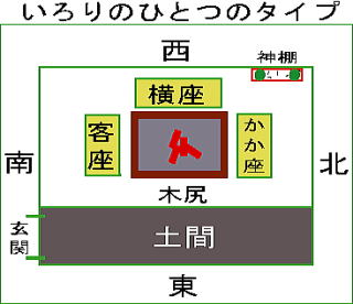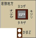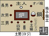 | 南飛騨 主人座(ヨコザ)、主婦座(カミガタ、カミザ)、客座(シモガタ、シモザ)、木尻(キノシリ、薪などを置き名称のない場合も) |