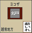 福井県は、若狭と越前の2国からなり、囲炉裏も少し違う。越前の囲炉裏にはカギナワ(鉤縄)が下がっているのに対し、若狭のいろりには、カナワ(カナワ・ゴトク)が置かれている。若狭の囲炉裏の横には薪置き場があり、小いろりと呼ばれた。越前では、囲炉裏を四座で囲むが若狭では一方に竃が作られている場合が多いので普通囲炉裏は、三座で囲んだ。 |
