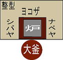 | 東濃 主人座(ヨコザ)、主婦座(イワテ、タナモト、ナベジロウ)、客座(キャクザ、ヨツギジロウ)、木尻(ダジリ、シモジロウ、薪置き) |